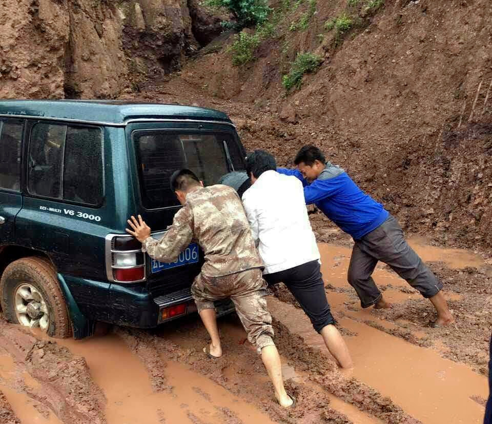 2016年6月,弥渡县牛街彝族乡,团队成员在泥泞的山路上前行