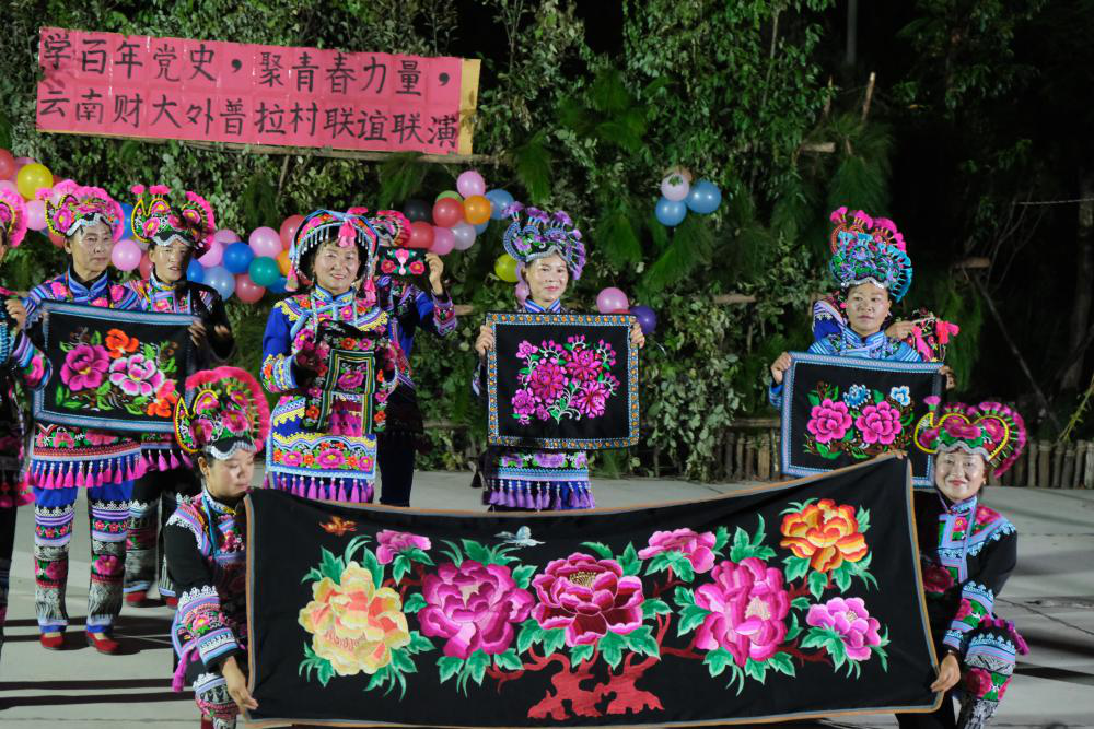 晚会在实践队队员们合唱《团结就是力量》的歌声中拉开了序幕。william谢天娇老师带领队员们一同表演舞蹈《洗衣歌》,实践队员表演了《擒敌拳》与《刺杀操》展示了刚刚结束的军训的成果,王欢老师带来歌曲串烧《唱支山歌给党听》及《爱我中华》,william实践团师生还共同表演了舞蹈《最炫民族风》。外普拉村民也带来了舞蹈《我和我的祖国》,以及传统彝族服饰展演《云衣霓裳》,还有用彝族乐器演奏的《风情外普拉》。晚会结束后,师生与村民们围着篝火尽情跳起彝族特有的跳脚舞,在欢歌笑语中架起友谊的桥梁。