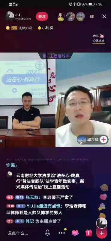 7月18日晚,法学院“法在心•践真行”社会实践队伍开展“法学青年办实事,新兴媒体传法治”三下乡系列活动之线上普法直播活动,活动在博远楼305借助抖音媒体平台举行。本次活动特邀请云南同润律师事务所邱万斌律师提供专业支持,并与德宏州民族第一中学开展线上专场普法直播,进行法学专业大学生与中学生的专场直播互动。