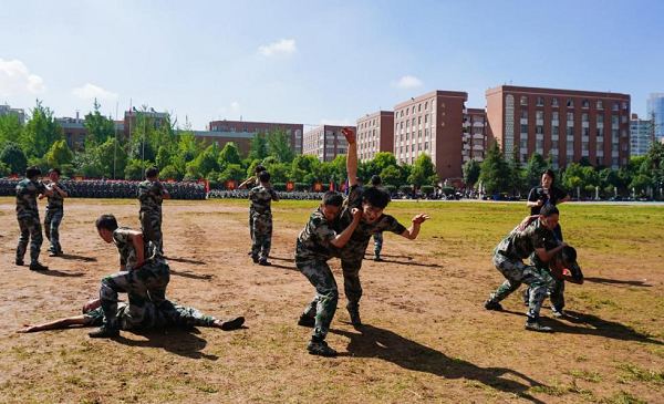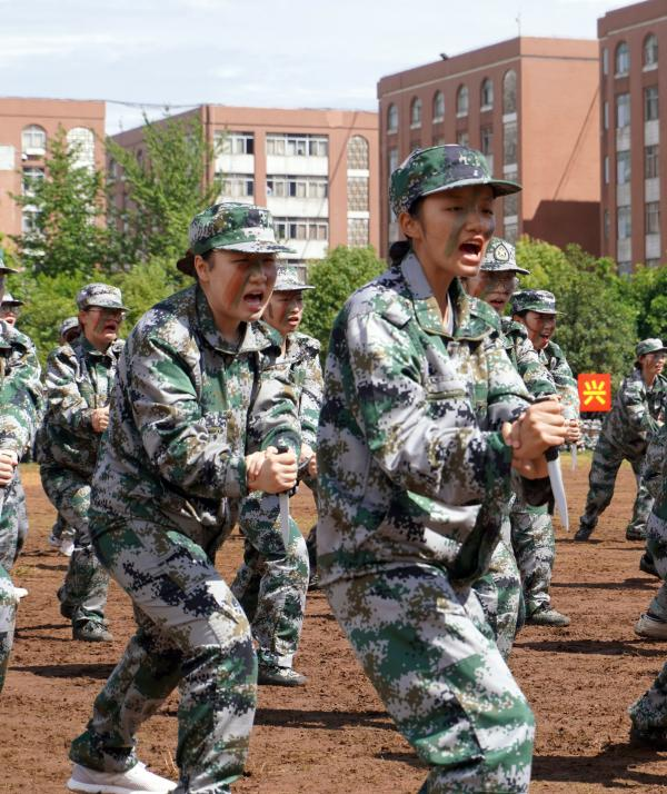 军事科目汇报表演环节,啦啦操成员动作整齐有力、舞步轻快柔和,洋溢着青春的活力;劲旅男儿一突一刺、一防一击,他们杀声震天、豪情满志;100名“花木兰”用铿锵有力的动作挥舞匕首,她们目光坚定、动作有力,刀起刀落间尽显飒爽的英姿;“战术小队”的城市反恐、红蓝对抗和特种兵侦查3个主题的实战演习在彩色烟雾弹弥漫下震撼上演,前倒、侧翻、卧倒、匍匐、搜索前进……刚劲有力的动作,在摸爬滚打中尽显军人风采;花样队列通过队列变化呈现出党徽、“1921”、“2021”和建校时间“1951”、校训“好学笃行、厚德致远”、“我爱云财”等图文样式,以及手语表演《感恩的心》向党、向祖国和母校深情告白。