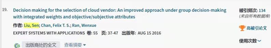 刘森教授于2016年以第一作者发表在期刊《EXPERT SYSTEMS WITH APPLICATIONS》的论文《Decision making for the selection of cloud vendor: An improved approach under group decision-making with integrated weights and objective/subjective attributes》,入选ESI高被引论文(Highly Cited Paper)。目前该论文在Web of Science核心合集中被引用次数为134次。