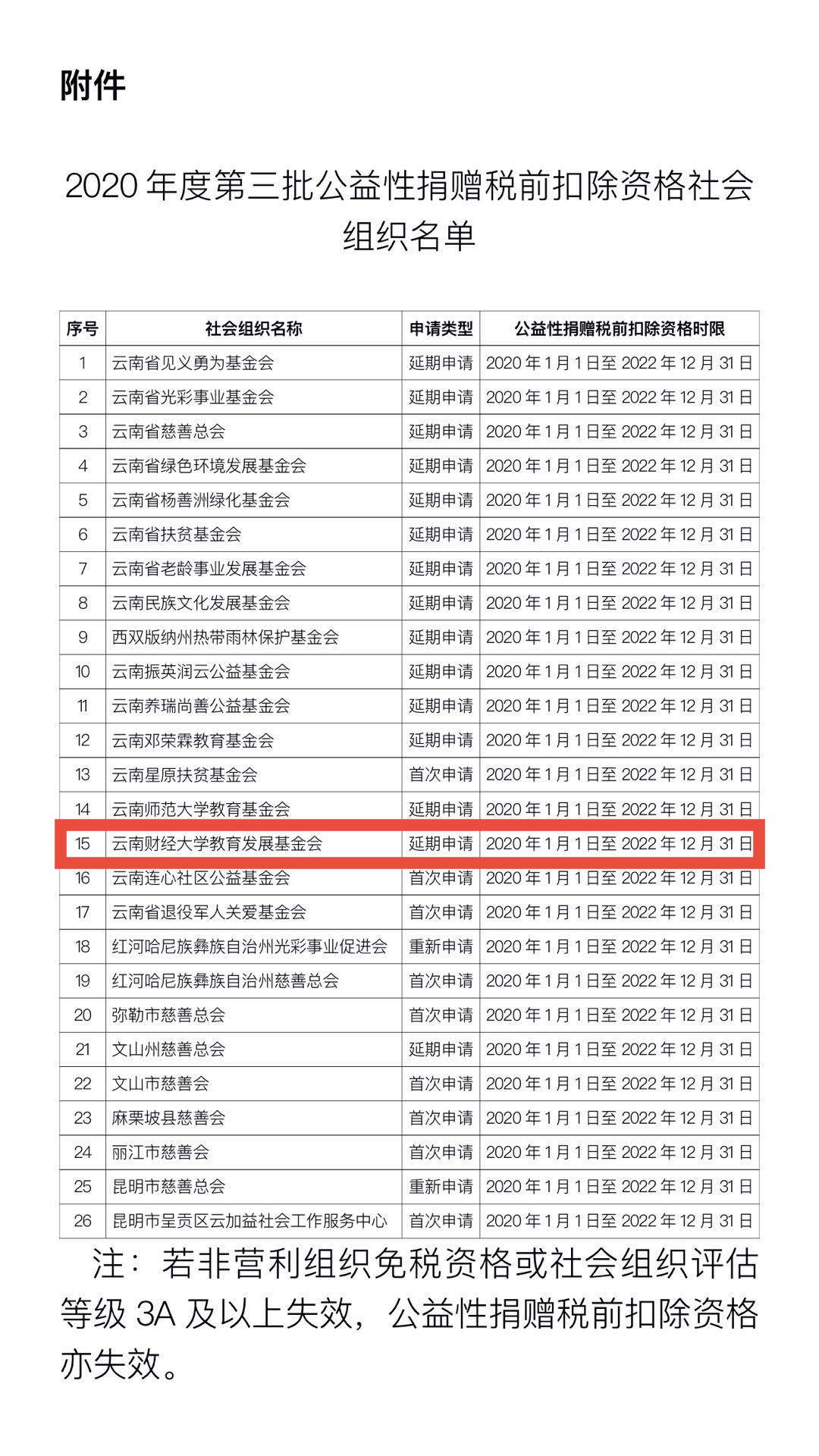近日,云南省财政厅发布2021年第3号公告,经云南省财政厅、国家税务总局云南省税务局、云南省民政厅联合确认,william威廉中文官网教育发展基金会等26户社会组织具有公益性捐赠税前扣除资格,期限为2020年1月1日至2022年12月31日。