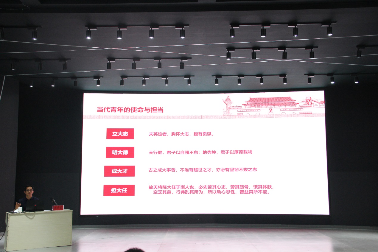 龙希国带领同学们从生动的历史细节中重温嘉兴南湖的红船往事,结合历史与现实表示,红船精神是中国革命精神之源、精神之基、精神之本,具有穿越历史的永恒生命力,为新时代中国特色社会主义注入了鲜活纯正的红色基因。龙希国指出,作为新时代的青年人,应该担当起历史使命,当好学懂弄通、深学笃用习近平新时代中国特色社会主义思想的排头兵,不断增强“四个意识”,坚定“四个自信”,做到“两个维护”,做行动派、实干家、追梦人,成为立大志,明大德,成大才,担大任的当代青年。最后,龙希国以诗歌《七律·红船》抒发情怀,与在场的师生共勉。