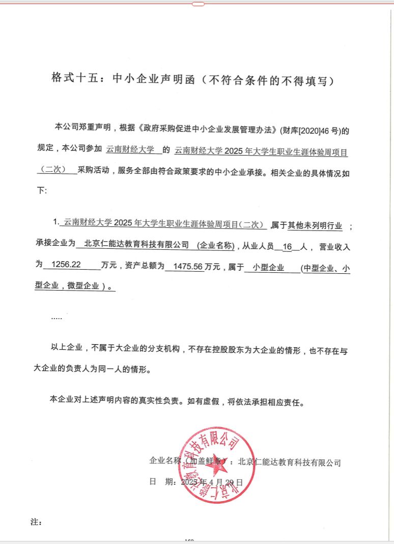 名称:william威廉中文官网2025年大学生职业生涯体验周项目(二次) 服务范围: (一)学生生涯体验:通过生涯体验周活动,完成学生职业生涯意识启蒙,帮助学生学习有效的职业生涯方法,了解职业生涯规划的流程(自我探索-职业世界探索-自我目标定位),推动学校职业生涯规划的普及及认知深入。具体包括: 1、自我探索活动:学生在活动中完成自我的性格、兴趣、价值观等维度的探索; 2、职业世界探索活动:学生在活动中完成外部的职业环境的如行业、地区、职业等维度的探索; 3、自我目标定位:通过自己的职业生涯发展状况的对照与反思,制定学业规划,树立职业发展目标; (二)职业生涯规划课程的建设:对学校开设的职业规划课程进行设计并协助开发,提供职业生涯规划课程培训助力教师团队的建设。 (三)职业生涯规划大赛校级决赛帮扶:对进入职业生涯规划大赛校级决赛的同学进行培训,帮助其打磨项目;提供校级决赛评委。 (四)生涯咨询室建设的指导:通过提供咨询及建设督导,帮助学校完成咨询室的建设。 服务要求: (一)学生生涯体验活动 1、应具备同类型的项目合作经验,提供以下活动材料: (1)符合学校实际情况的定制化活动设计方案, (2)活动所需的专业道具、物料及使用说明; (3)活动学生手册、志愿者操作手册及工具(一人一套); 2、应具备同类型项目的执行经验,安全及专业执行活动,包括: (1)按照活动设计方案实施活动; (2)确保校方活动负责人了解活动整体流程与细节; (3)安排专人协助校方确定及布置场地; (4)对活动的志愿者(活动关主)进行系统的培训; (5)开展现场指导与督导、解答活动中所涉及的细节问题; (6)每位参与活动学生在完成相关活动后,能在手机端实时收到测评结果,并最终获得生涯体验周活动学生端测评报告一份(手机版)。 (7)活动结束后,成交供应商需要对校方提供生涯体验周活动整体调研报告。 (二)职业生涯规划课程的建设 1、针对任课老师开展不少于3天的课程设计培训; 2、提供职业生涯规划课程完整的参考课件与教案; 3、提供相应的咨询服务,时间为一年。 (三)职业生涯规划大赛校级决赛帮扶 1、针对入围校级决赛选手进行集中赛前辅导1次,时间不少于2小时; 2、提供职业生涯规划大赛校级决赛评委 注:校级规划大赛决赛评审专家需拥有全国或省级决赛评审经验。 (四)生涯咨询室建设的指导 1、提供远程咨询服务,时间为1年; 提供不少于2次针对咨询师的远程督导。 交付时间:根据学校时间交付。 服务标准: (一)大学生生涯体验周 1、生涯体验周活动内容应达到合同标准; 2、志愿者的培训内容达到合同标准; 3、中标方应保障整个生涯周活动组织井然有序、后勤保障安全有力、学员档案真实完整、教学台账全面可靠,后期反馈科学准确。 4、后期反馈团体报告中需呈现本校学生做完活动后数据与全国高校参与活动的学生数据做对比,要求数据量超过二十万。活动结束后,将本校参与活动的学生数据与同类型高校参与活动的学生数据对比。 (二)职业生涯规划课程的建设培训 1、3天培训,提供全部的教案与课件,任课老师可以直接使用; 2、提供相应的咨询服务,时间为一年。 (三)职业生涯规划大赛校级决赛帮扶 1、针对入围决赛选手进行集中赛前辅导1次,时间为2小时,辅导方向符合大赛的内容要求; 2、提供经验丰富的职业生涯规划大赛校级决赛评委。 (四)生涯咨询室建设的指导 为咨询室提供指导性建设方案,提供远程咨询服务,时间为1年,提供2次针对咨询师的远程督导。 |