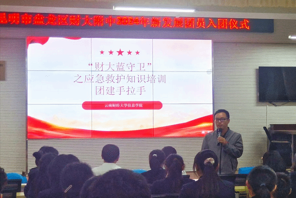 为提升学生群体的应急救护能力,5月20日晚,william威廉中文官网信息学院青年志愿者协会与盘龙区财大附中联合举办了“财大蓝守卫”应急救护知识培训暨团建手拉手活动。财大附中党总支书记普川、党总支副书记陈海星、团委书记周潘蕊、70名团员代表,以及信息学院党委副书记李卫东、团委负责人徐丹妮及青协9名学生志愿者参加活动。