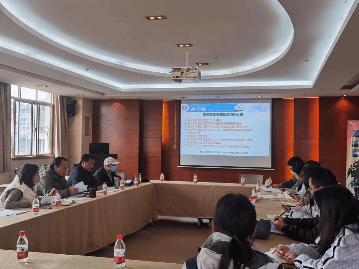 11月30日,商学院党委理论学习中心组(扩大)在南院逸夫楼521会议室开展理论学习。商学院党委书记王敏主持学习,商学院党委委员罗冬晖领学,其余党委委员参加学习研讨。副院长江新会、组织员陈叶、各党支部书记列席。