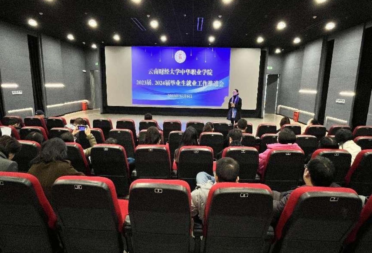 12月6日下午,中华职业学院在安宁校区图书馆放映厅召开2023届、2024届毕业生就业工作推进会。学院大学生就业创业工作领导小组成员、就业与创业服务办公室就业工作专干、各教学部负责就业工作的辅导员以及2023届、2024届毕业班班主任参加会议。会议由学院党委副书记兼纪委书记张玉琨主持。