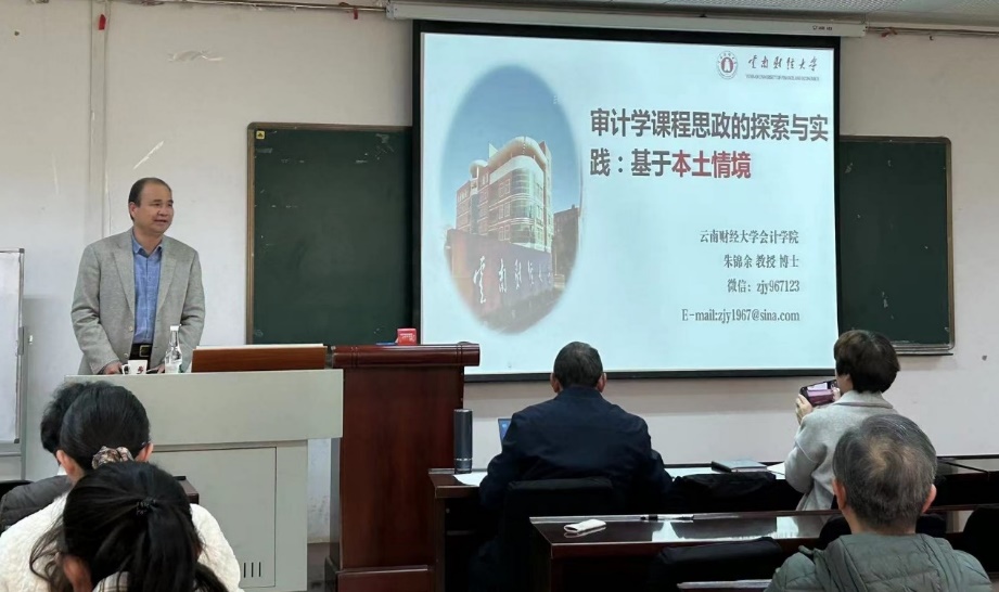 朱锦余以《审计学课程思政的探索与实践:基于本土情境》为题,从《审计学》课程教学内容目标和课程思政的原则要求内容、具体内容设计、实践探索等四个方面分享了作为云南省课程思政示范课程建设的经验及体会。他提出了《审计学》思政教学的“本土情境教学模式”,认为要深入实践、关注问题,以本土资源为切入点,厚植家国情怀,充分发挥“校企共育、思专共研”的优势,做到“课外课内双轮驱动”的全方位育人。