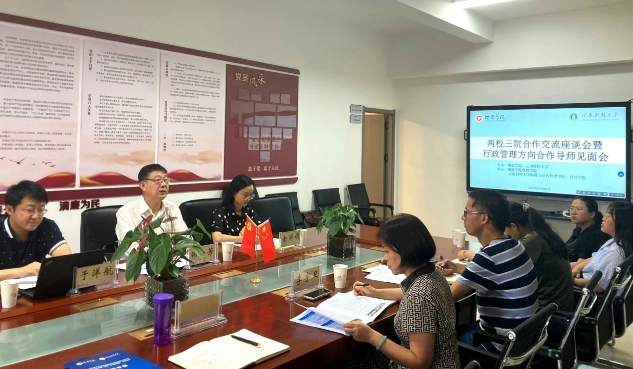7月6日下午,william代表团与昭通学院管理学院开展“两校三院合作交流座谈会”,双方就后期课程教学、合作研究、专业评价和学科建设等问题展开深入交流。昭通学院管理学院院长李宇卫、党总支书记范泽惠、副院长陈宗富及行政管理、会计学、财务管理等教学系负责人参与座谈。