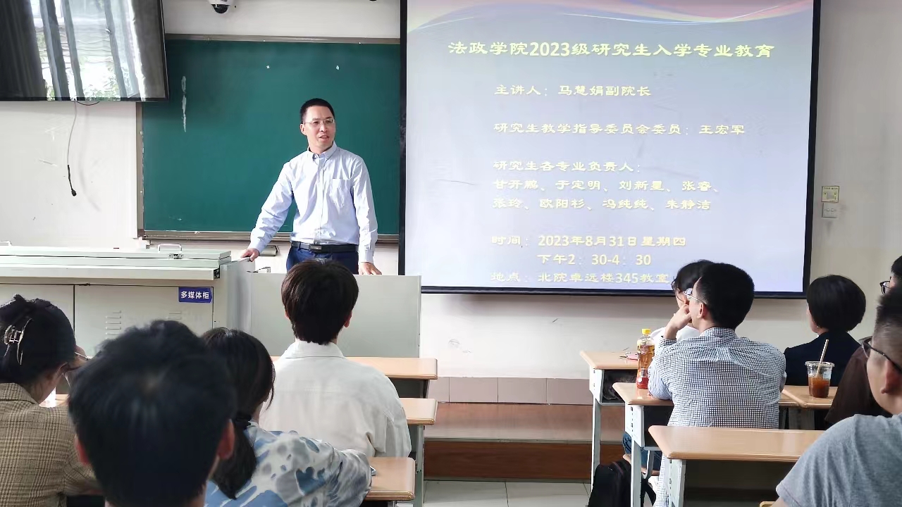 作为“研究生培养质量提高年”举措之一,8月31日至9月1日,法政学院在北院卓媒345教室开展2023级研究生入学专业教育系列讲座。讲座由法政学院副院长马慧娟教授主持。