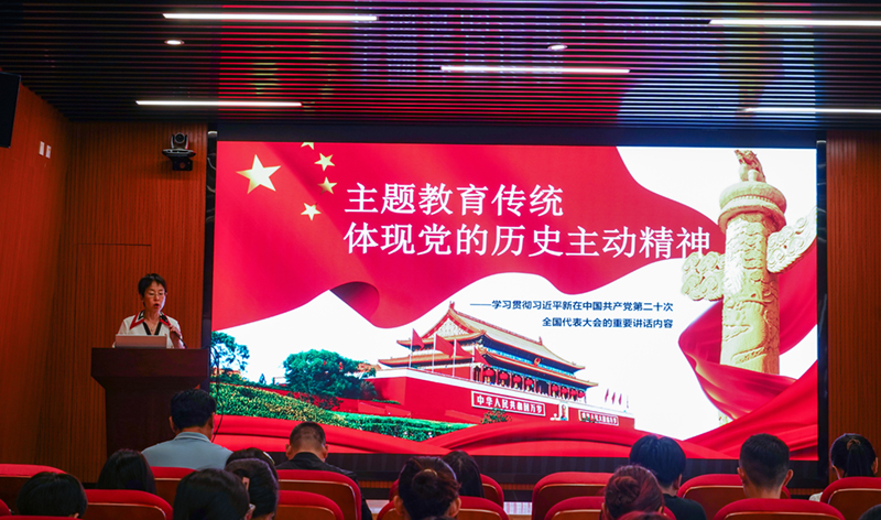 袁洪向受表彰的“两优一先”集体和个人表示祝贺,感谢师生过去一年在以一流党建引领学院高质量建设发展中所做出的贡献,同时开展题为《主题教育传统体现党的历史主动精神——学习贯彻习近平在中国共产党第二十次全国代表大会的重要讲话精神》专题党课,从“习近平总书记在中国共产党第二十次全国代表大会的重要讲话内容及含义、新中国历史进程回顾、新中国辉煌成就、新中国经验启示、展望未来·使命与担当”5个方面与大家进行了分享,要求学院全体师生在学思践悟中汲取矢志不渝的理想信念,为中华民族的伟大复兴而奋斗,为学院的发展共同努力,不断把学院办学育人推向新的更高水平。