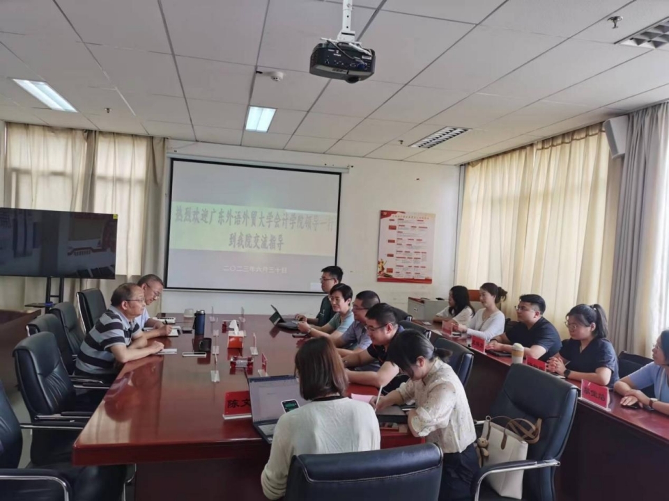 陈永飞对广东外语外贸大学会计学院一行的到访表示热烈欢迎。他介绍了学院的基本情况,从学科建设、师资团队、人才培养、社会服务、政府支持等方面重点介绍了学院开展的工作及特色亮点。李丽忠对学院高质量党建引领高质量发展的经验做法、思政育人理念及毕业生就业创业工作成效进行了介绍。