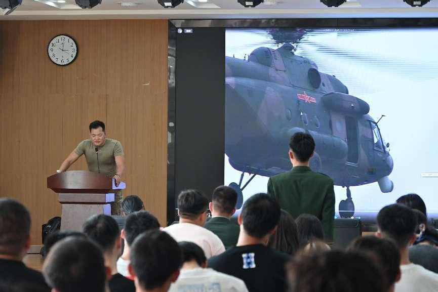 曾获国际特种兵比武最佳狙击手、荣立一等功、某军事行动战斗英雄、第七届世界军运会火炬手的转业干部金伟强分享了二十年精彩丰富的军旅生涯。他讲述了2008年汶川地震救援等相关经历,希望同学们踊跃报名应征,保持热爱、坚定信念、坚持到底。