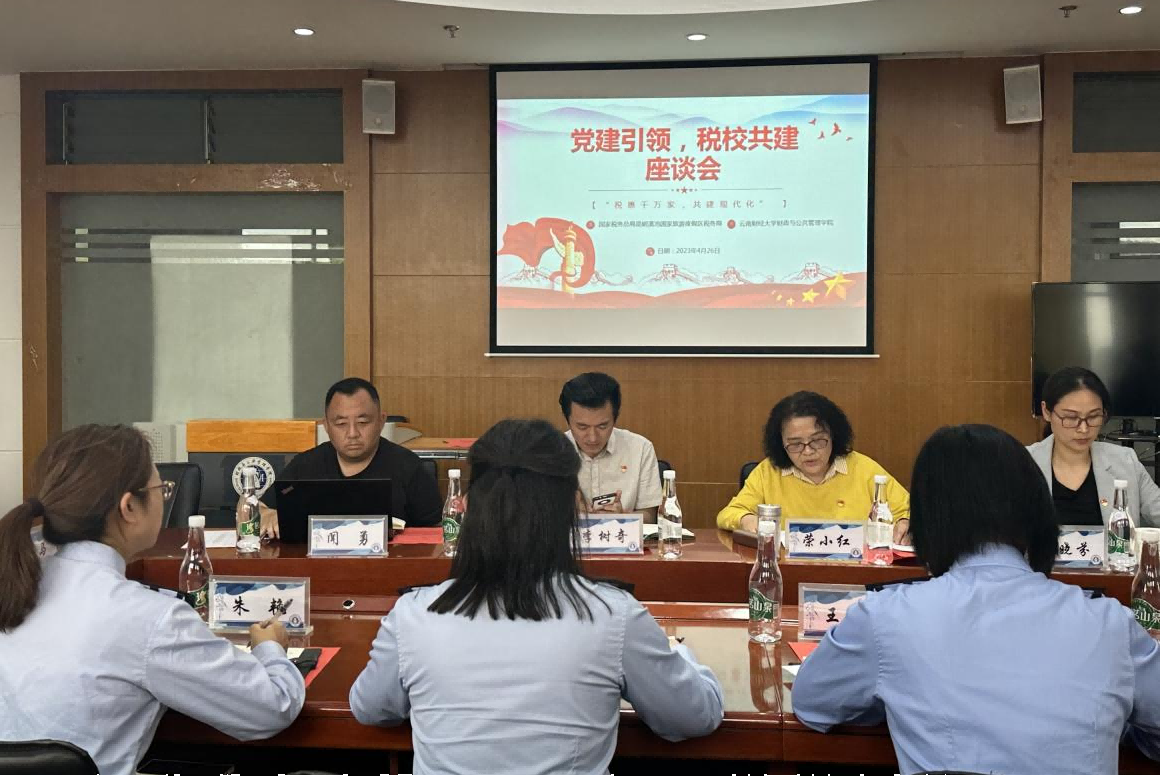 4月26日下午,双方在逸夫楼923召开“党建引领,税校共建”座谈会。国家税务总局昆明滇池国家旅游度假区税务局党委书记、局长王炯,党委委员、副局长刘玥,财政与公共管理学院党委书记荣小红、党委副书记王晓芬、副处级组织员杨燕红参加座谈,会议由教工第二党支部书记李树奇主持。