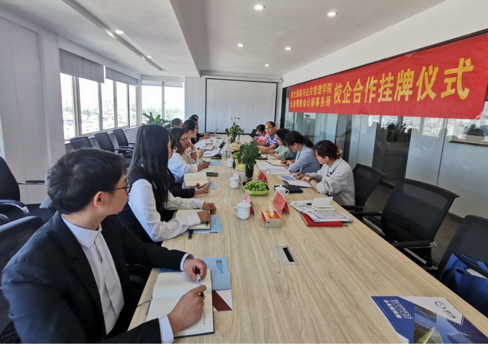 5月18日上午,财政与公共管理学院党委书记荣小红、党委副书记王晓芬、副院长和立道一行赴云南明博会计师事务所开展访企拓岗调研活动,同时双方举行“财政与公共管理学院教学实践基地”挂牌仪式。