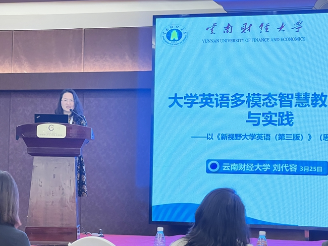 下午,八场专题论坛同步举行,88位专题论坛发言人聚焦“四新”建设、“一流课程”建设、国际传播人才培养、“理解当代中国”系列课程建设、外语教育数字化转型、教材建设、教师发展等高等外语教育核心议题,与来自全国的外语教育专家及一线外语教师共话高等外语教育教学发展的挑战与机遇、创新与变革、探索与实践。刘代容在“智能与赋能论坛:基于Unipus的外语教育转型创新”专题论坛作了题为“大学英语多模态智慧教学改革与实践——以《新视野大学英语(第三版)》(思政智慧版)为例”的主题发言,简要回顾了学校历史,着重介绍了大英中心智慧教学路径和成果,并分享了课程思政教学案例,发言获得了阵阵热烈的掌声。