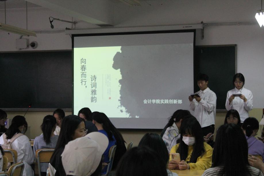 为提升学生课余文化情调、丰富诗词储备,进一步弘扬、继承中华优秀传统文化,3月25日,会计学院在南院凌云楼南501举办了“悦读”系列第三期读书会“向春而行,诗词雅韵”趣味竞答活动,一百名在校生参加活动。
