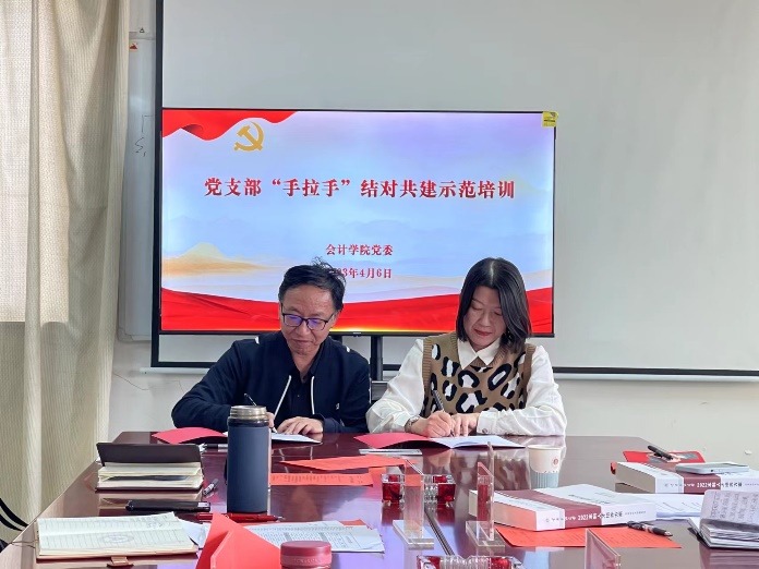 双方介绍了各自学院学科专业、办学历史及规模情况,并就人才培养、专业综合评价、党支部书记培养选拔、发展党员工作、学生管理、高质量就业等方面进行了交流讨论。双方学院党委书记签订了党建工作“手拉手”结对共建协议并相互授牌,商学院(数字经济产业学院)党委教工党支部和会计学院党委教工第二党支部签订了共建协议。