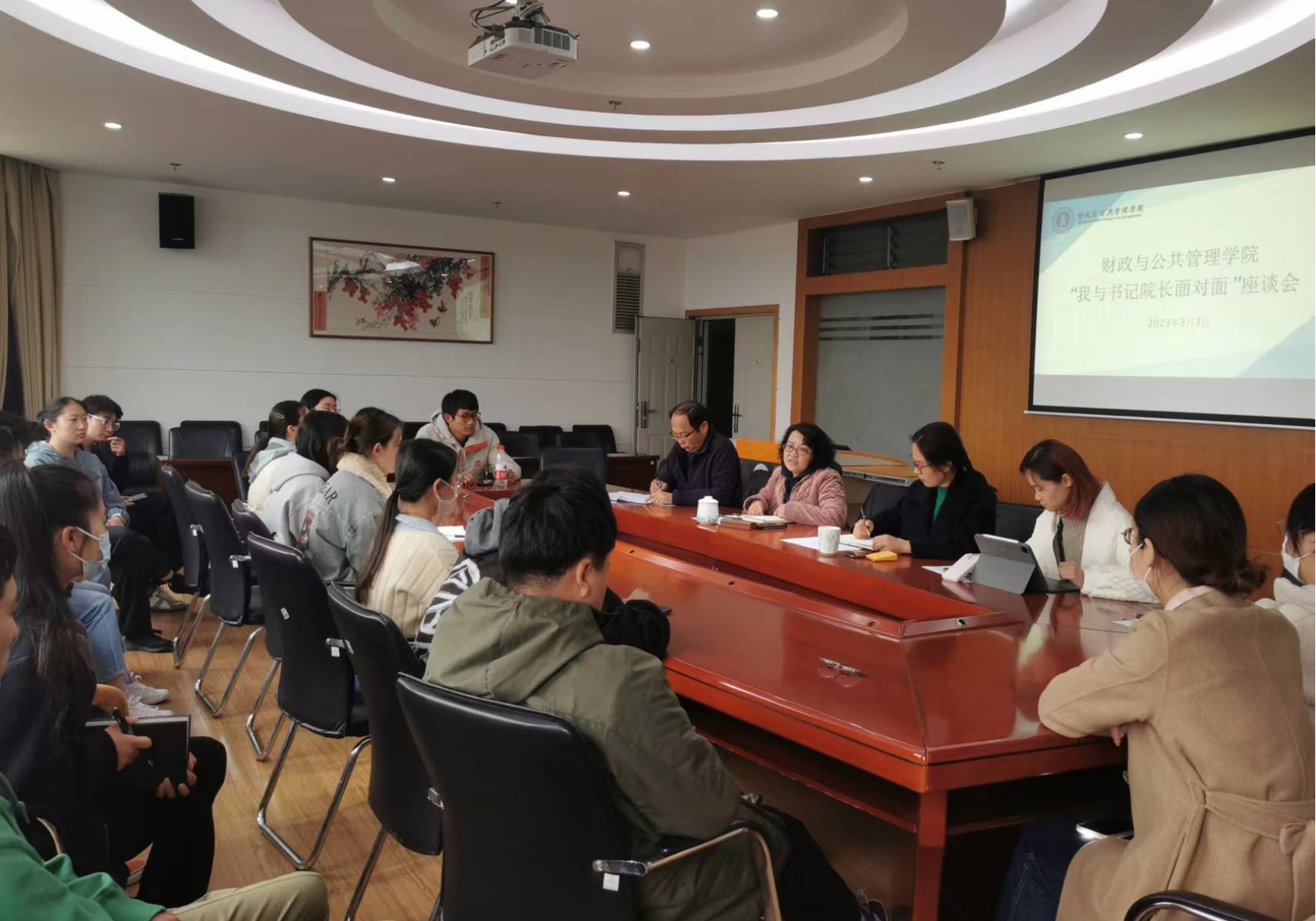 3月3日上午,财政与公共管理学院在南院逸夫楼923举行“我与书记院长面对面”座谈会。学院党委书记荣小红、党委副书记王晓芬、副院长和立道、学生管理科科长饶篁、辅导员毛丹及本硕毕业生代表参加座谈。会议由王晓芬主持。