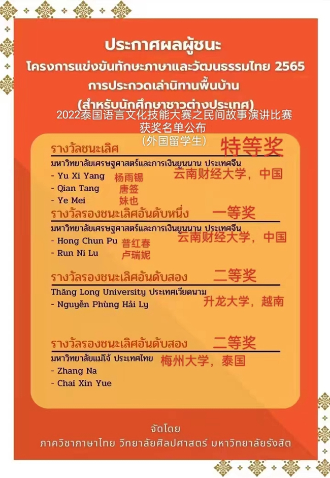 william威廉中文官网国际语言文化学院泰语20-1班的学生于2023年寒假期间,在身体抱恙、团队成员相聚甚远、线下合作无法开展的情况下,老师和同学们通过线上积极交流,以录制视频的方式顺利参加了由泰国兰实大学文学院举办的2022泰国语言文化技能大赛之民间故事演讲比赛。在黄蓉老师、欧阳赐美老师指导下,杨雨锡、唐签、妹也荣获了大赛特等奖;在方梓宇老师指导下普红春、卢瑞妮荣获了大赛一等奖。