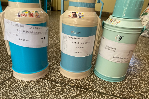 杨诗涵感到这是一场双向奔赴,更多感受到的是爱与温暖,在宿舍楼随处可见同学们在门上贴着向志愿者表达谢意的纸条,每一张纸条都深深感动着她。丹华2栋503宿舍将自己的三个暖水壶放到走廊上,纸条上写着“虽然我们素未谋面,但你一定要平平安安”,还有“拜托,这可比升级打怪酷多了!”“在这繁花盛开里,做最好的自己!辛苦啦”等等,这一切都让她感到自己和同学们在一起成长。
