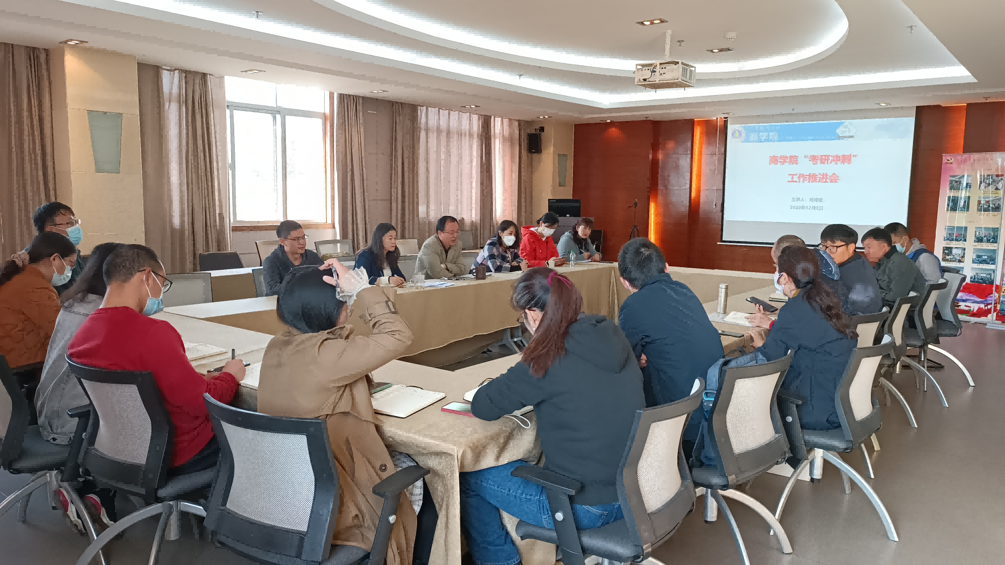 12月2日上午,商学院举行“考研冲刺”工作推进会,研究部署学院考研工作。会议由学院院长杨增雄主持,学院党委书记王敏、党委副书记蒋见证、副院长江新会、各系主任、专业负责人和毕业班班主任参加会议。