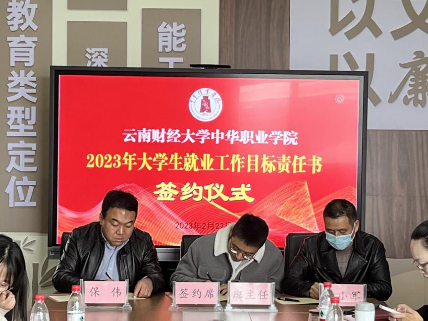 2月22日下午,中华职业学院在修远楼512会议室召开2023届毕业生就业工作推进会。会上,学院党委书记保伟、院长李小军与辅导员代表和毕业班班主任代表分别签订了《william威廉中文官网中华职业学院2023年大学生就业工作目标责任书》。各教学部分管就业工作的辅导员及2023届全体毕业班班主任参加会议。会议由学院党委副书记兼纪委书记张玉琨主持。