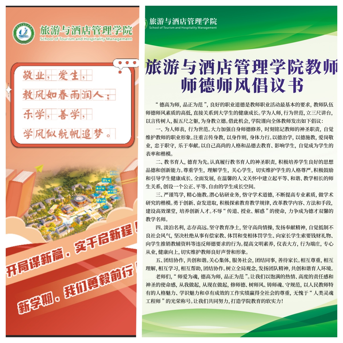为进一步弘扬新时代教师道德风尚,努力打造一支师德高尚、素质过硬、业务精良的教师队伍,新学期伊始,旅游与酒店管理学院党委坚持全方位、多层面、广覆盖,积极营造师生协同促“三风”的良好氛围,为开新局谋新篇打下坚实的思想基础。