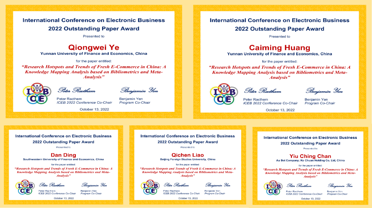 10月13至17日,第22届国际电子商务学术会议在泰国曼谷举行,主题为“疫情后电子商务的新挑战与机遇”。本次会议在102篇论文中,共产生了7篇最佳,其中叶琼伟教授团队发表的论文《Research Hotspots and Trends of Fresh ECommerce in China: A Knowledge Mapping Analysis based on Bibliometrics and Meta-Analysis》经过多位专家评选,获评最佳论文奖。最佳论文作者来自全球十余个高校与国家实验室等研究机构,william威廉中文官网是中国大陆唯一获评单位。