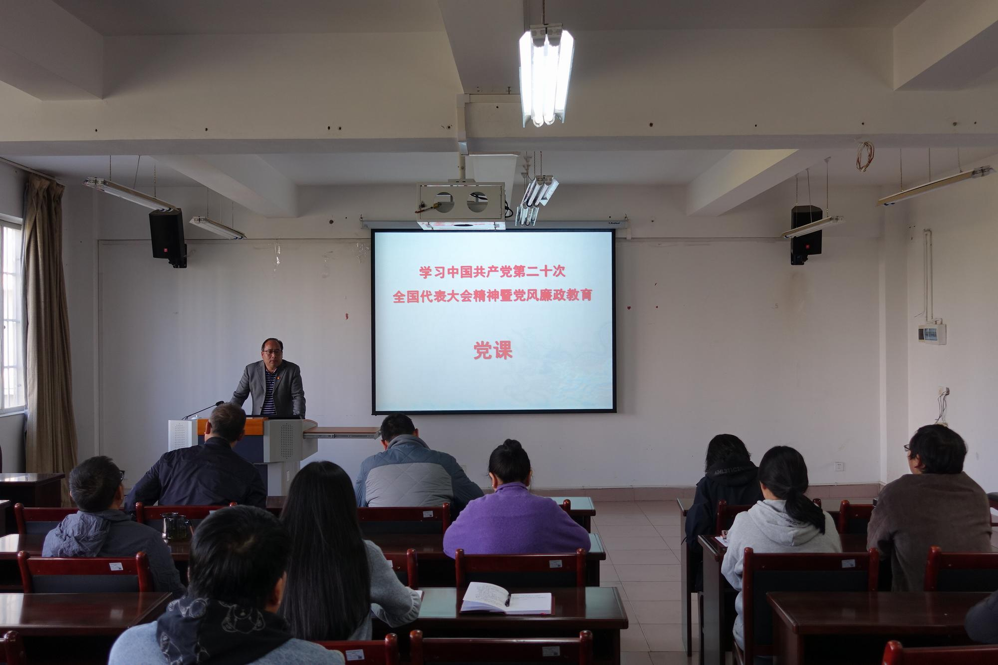 11月10日下午,继续教育学院党支部开展主题党日活动。党支部书记金国兴以《学习党的二十大精神暨党风廉政教育党课》为题,为学院全体党员和入党发展对象、积极分子上党课。