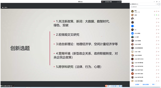 具体选题内容,林雁向同学们展示了部分传统选题和创新选题。在传统选题层面,林雁认为比较常见的几个话题有信息披露、盈余管理、高管特征、董事会、独立董事、融资、投资、企业合并、股权变更、内部控制、审计质量、审计意见、审计收费、税收筹划、企业社会责任等,在选题时也可以根据几类常见的话题衍生出更多关键词,进而得到一些创新选题,如信息披露方面可以衍生出环境信息、ESG信息披露等;融资方面可以结合北交所成立、资本市场开放、绿色信贷等;企业合并方面可以关注混改、长期股权投资处理、商誉处理等;企业创新方面可以涉及绿色技术创新、文化与企业行为等方向。林雁还提醒大家需要关注新政策、新概念(例如大数据、数智时代、绿色、双碳等),关注宏微观交叉研究,结合新理论(例如地理经济学、空间计量经济学等),考虑营商环境(如新型政企关系、政府职能转变、对央企民企的政策等),还需要进行跨学科研究(如法律、行为、心理等方面)。