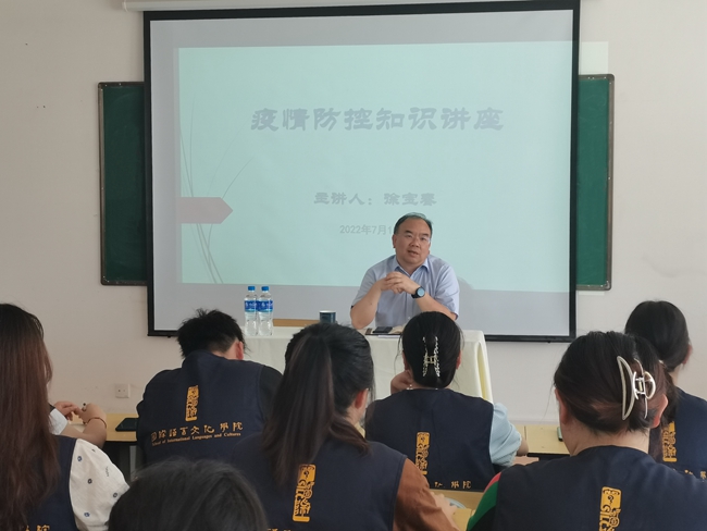 为提升疫情防控意识,确保校园安全和师生健康,7月15日下午,国际语言文化学院在博远楼415开展疫情防控知识讲座。校党委委员、宣传部部长徐宝春应邀主讲,国际语言文化学院党委副书记俞虹主持,学院团委书记马婧和全体学生骨干参加了讲座。