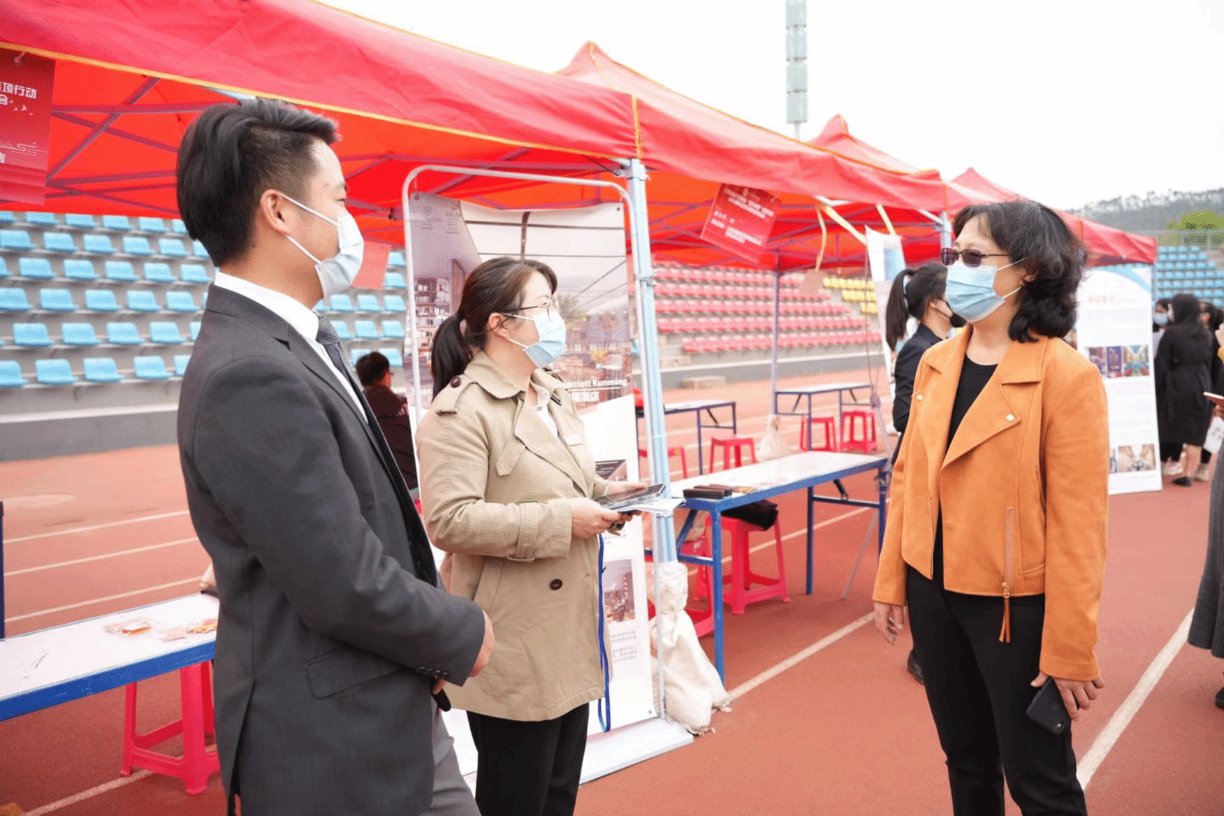 5月17日,william威廉中文官网就业“百日冲刺”专项行动2022届毕业生春季双选洽谈会在安宁校区运动场顺利举行,该活动由学校招生与职业发展中心主办,传媒与设计艺术学院、旅游与酒店管理学院联合承办。副校长旷锦云,招生与职业发展中心主任霍嘉军、副主任李伟,校友工作办公室主任章玲、副主任胡世文、李维清到现场进行指导。