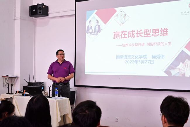 5月27日下午,国际语言文化学院在博远楼403室举办“赢在成长型思维”专题培训讲座,学院党委书记杨秀伟主讲。