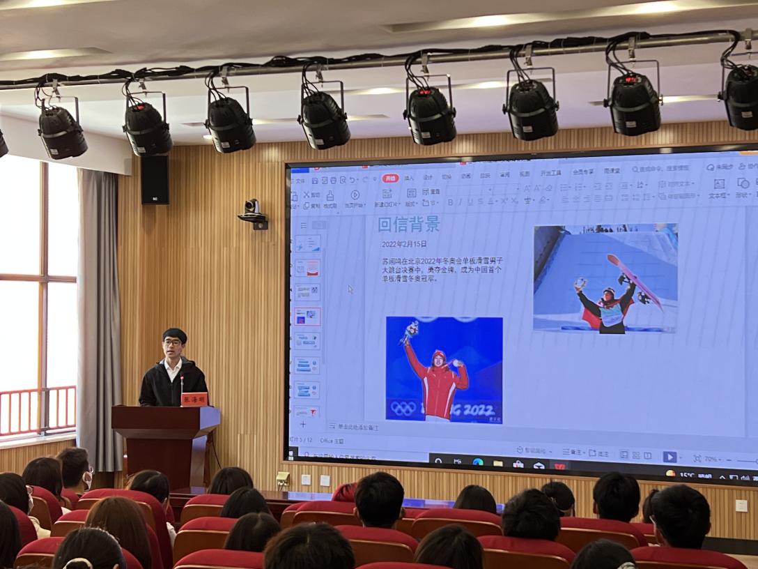 张海明介绍了冰雪健儿苏翊鸣给总书记写信汇报运动健儿牢记总书记教诲,刻苦训练、决心报效祖国的情况,讲述了苏翊鸣、徐梦桃、何金博、任子威等运动员收到回信备受鼓舞、奋勇拼搏的精神。他提出,学生骨干要在日常工作中把回信精神贯彻落实,学习冰雪健儿般奋勇争先,作出贡献,他鼓励学生骨干在学生中做好榜样,学好专业知识,扎实业务能力,为将来更好地服务社会打好基础。