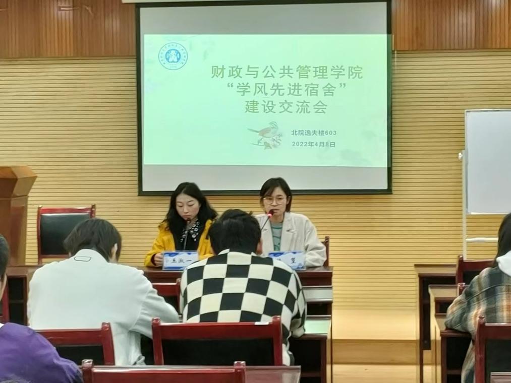 4月8日下午,财政与公共管理学院在北院逸夫楼603室举行“学风先进宿舍”建设交流会。学院学生管理科科长饶篁、辅导员王淑一就推进“学风先进宿舍”建设等相关问题与各班班长、学生代表们进行交流,南院各班未能到场的学生代表们以网络直播的形式同步参与学习。