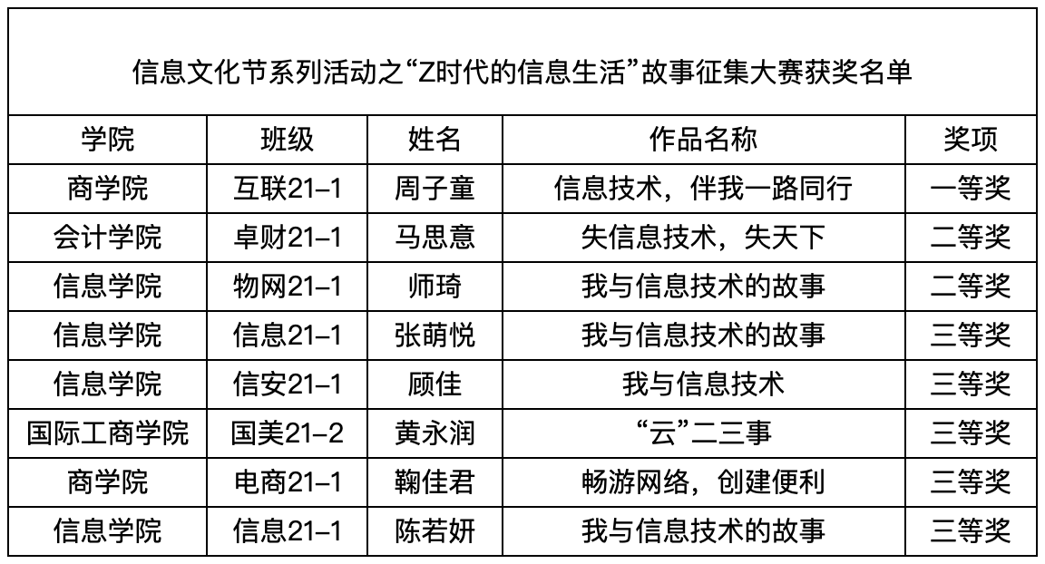 本次大赛面向全校同学征集作品。参赛作品故事多样,有的讲述了从小接触计算机从而对信息技术产生了浓厚兴趣;有的讲述了自己身边人对自己的影响,立志要从事信息技术行业;还有的讲述了信息技术带来便捷等等。经评选,共有16份优秀作品获奖,部分获奖名单如下: