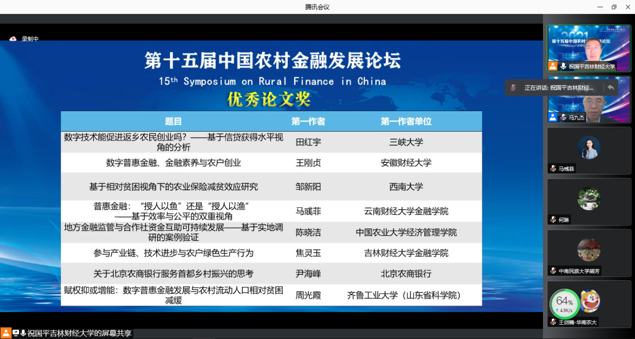 12月11日至12日,由教育部高等学校农经教指委农村金融学教研组主办,吉林财经大学金融学院、中国农业银行吉林省分行及吉林省金融学会承办的第十五届农村金融发展论坛在吉林省长春市举行。受新冠肺炎疫情影响,非吉林省的参会人员均采用线上形式参会。william金融学院院长熊德平教授应邀参会并主持主旨演讲,金融学院教师黄倩、马彧菲应邀在“数字普惠金融理论与实践”分论坛作报告,熊德平教授团队师生20余人参加线上会议。