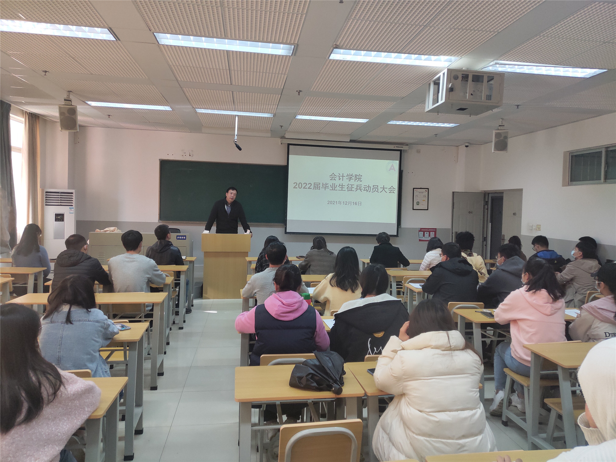 12月16日,会计学院在逸夫楼211召开2022届毕业生征兵动员大会,学院党委书记徐良金、副书记王涛,副院长刘昌胜,毕业班辅导员、班主任、班委以及学院有入伍意向的学生参加会议,会议由王涛主持。
