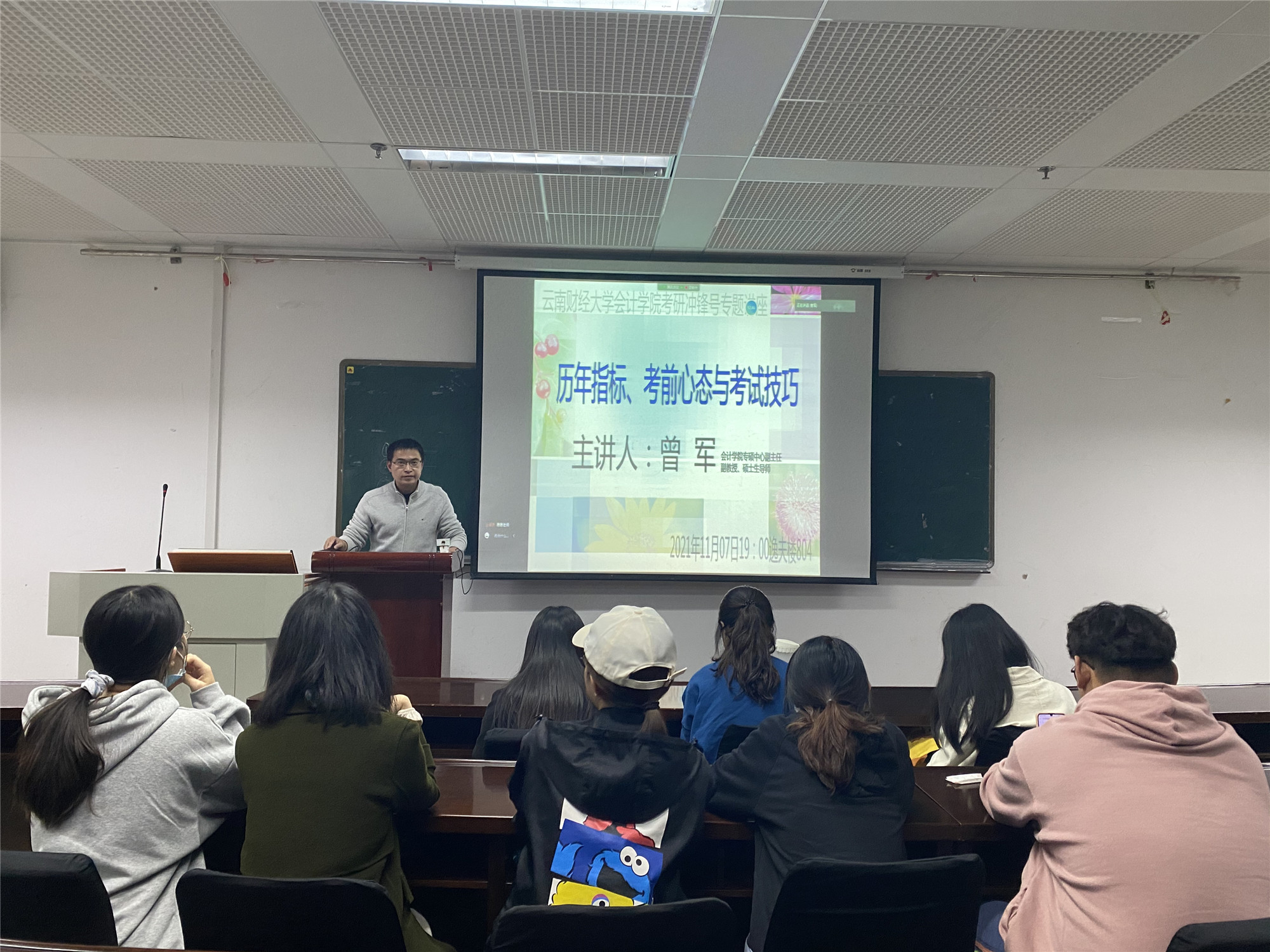 曾军分别从全国样本和云财样本两个层面对历年的考研相关指标进行了分析,让考生深入了解全国和本校会计学院相关专业的考研形势,并结合会计学院历年考研指标统计,介绍了各专业历年招考情况的总体特征和变化趋势。他还针对考生考前容易焦虑的普遍问题,指导考生从多角度进行考前心态调整和考试技巧应用。