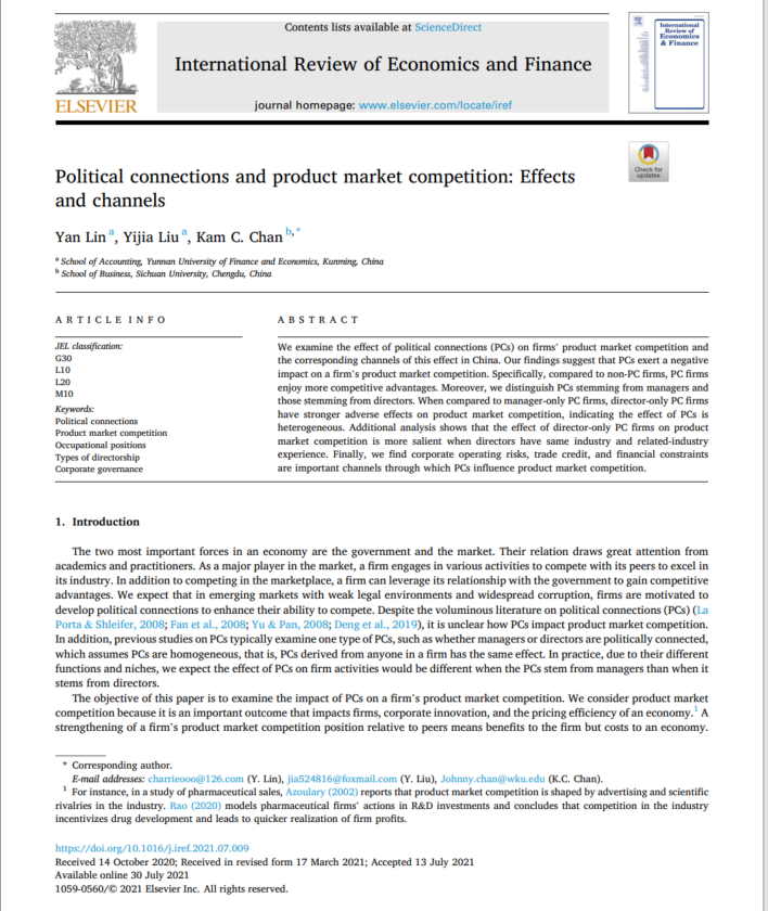 今年7月,会计学院副教授林雁博士以第一作者身份在经济学SSCI JCR二区期刊《International Review of Economics & Finance》发表学术论文《Political connections and product market competition: Effects and channels》(2021年76卷第11期)。