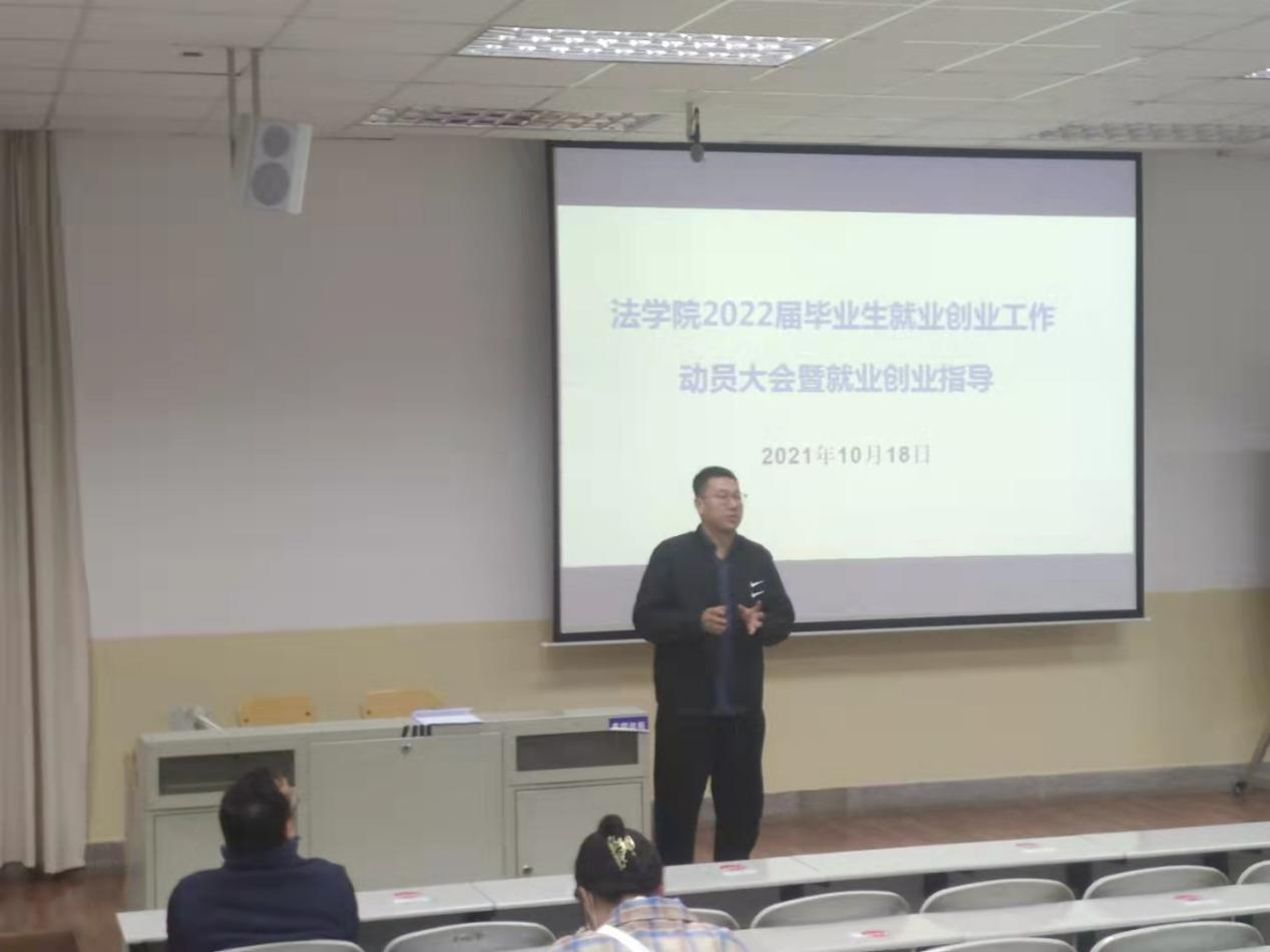 为积极响应国家新发展形态下就业优先战略,认真贯彻落实学校2022届毕业生就业创业工作动员大会精神,做好2022届毕业生就业指导及服务工作,引导学生树立正确的就业择业观,法学院于10月18日晚上在凌云楼南附401室召开就业创业工作动员大会。法学院党委副书记王俊、学校招生与职业发展中心教师张志超作动员指导,2022届毕业班班主任及全体在校毕业生参加会议。