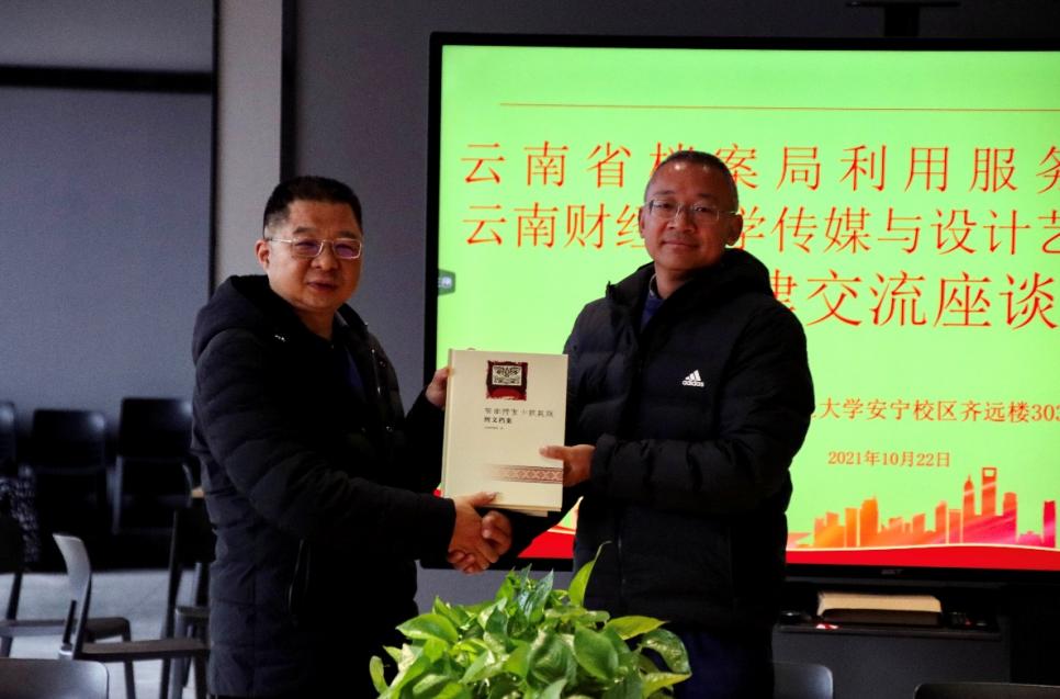 梁屹峰介绍了省档案局利用服务处的工作职能和档案开发利用方面取得的成果及社会评价情况,表示愿意在档案文化产品开发利用和党建工作上加强合作共建。同时还向学院捐赠了《云南省档案馆馆藏字画选集》、《影像中的记忆——滇西抗战图文档案》等12本档案开发的最新成果。