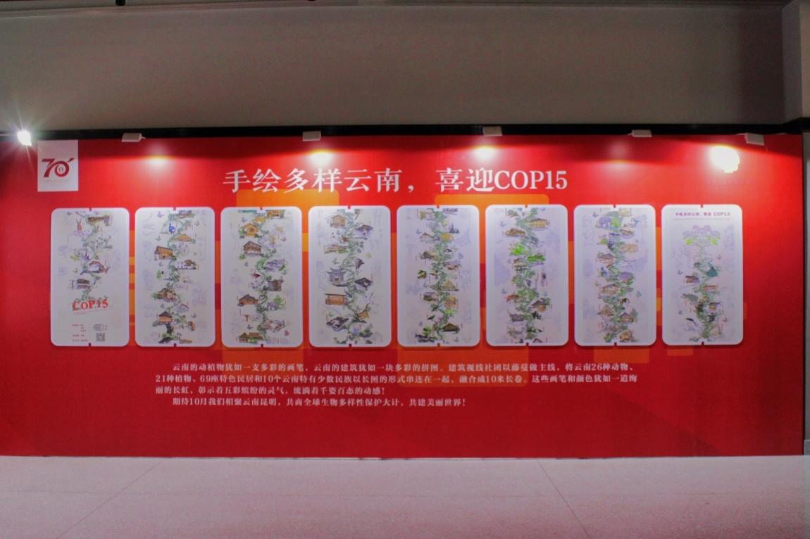 学院建筑视线社团学生绘制的《手绘多样云南》COP15生物多样性大会画卷以藤曼做主线,将云南的特色植物、动物、民居和10个云南特有少数民族以长图的形式串联在一起,融合成10米长卷。