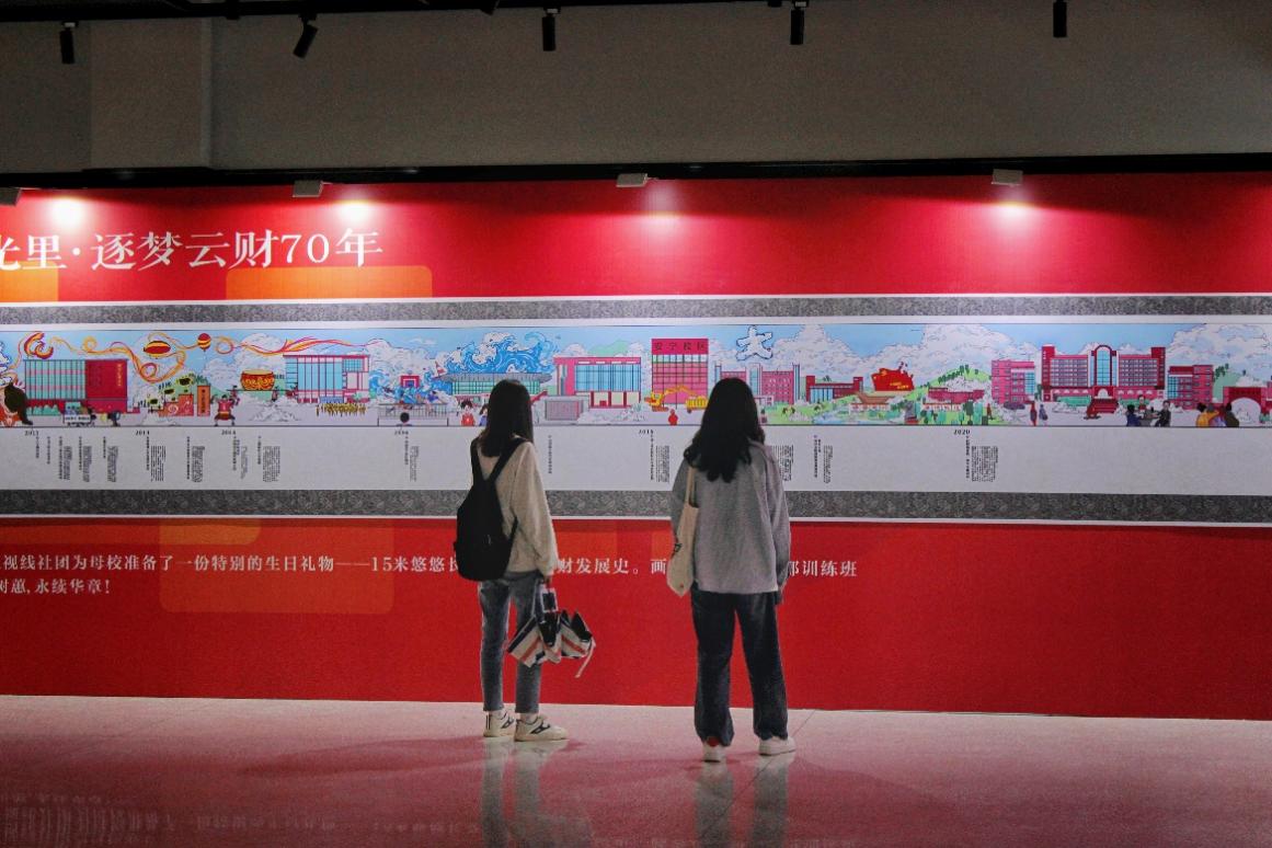 长达15米的《手绘云财七十年》幽幽长卷学院是学院师生为迎接70周年校庆到来准备的一份特别的生日礼物。画卷从最初的干部训练班开始,将学校建筑,人文历史等云财故事融入其中,展现了云财70年一路走来的发展历程和光辉成就。