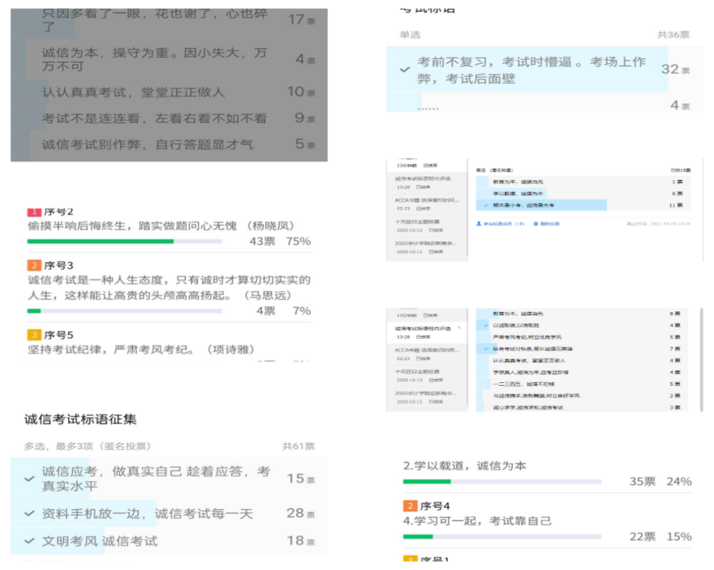 6月9日下午,为加强我院学生的文明守纪观念,强化学院考风考纪建设,营造积极向上的良好氛围,会计学院团委在各班级中组织开展“诚信考试标语征集”活动。