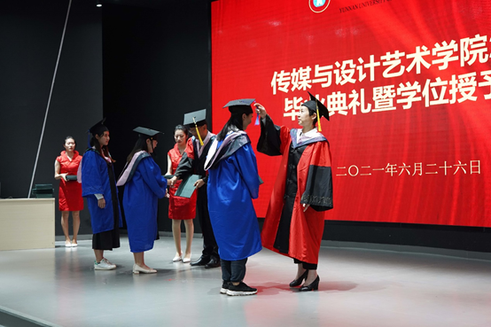 6月26日下午,传媒与设计艺术学院2021届毕业典礼暨学位授予仪式在北院路演大厅举行。学院院长袁洪宣读学位授予决定,与学院党委书记李丽忠共同为267名本科毕业生和17名硕士毕业生拨穗并授予学位。
