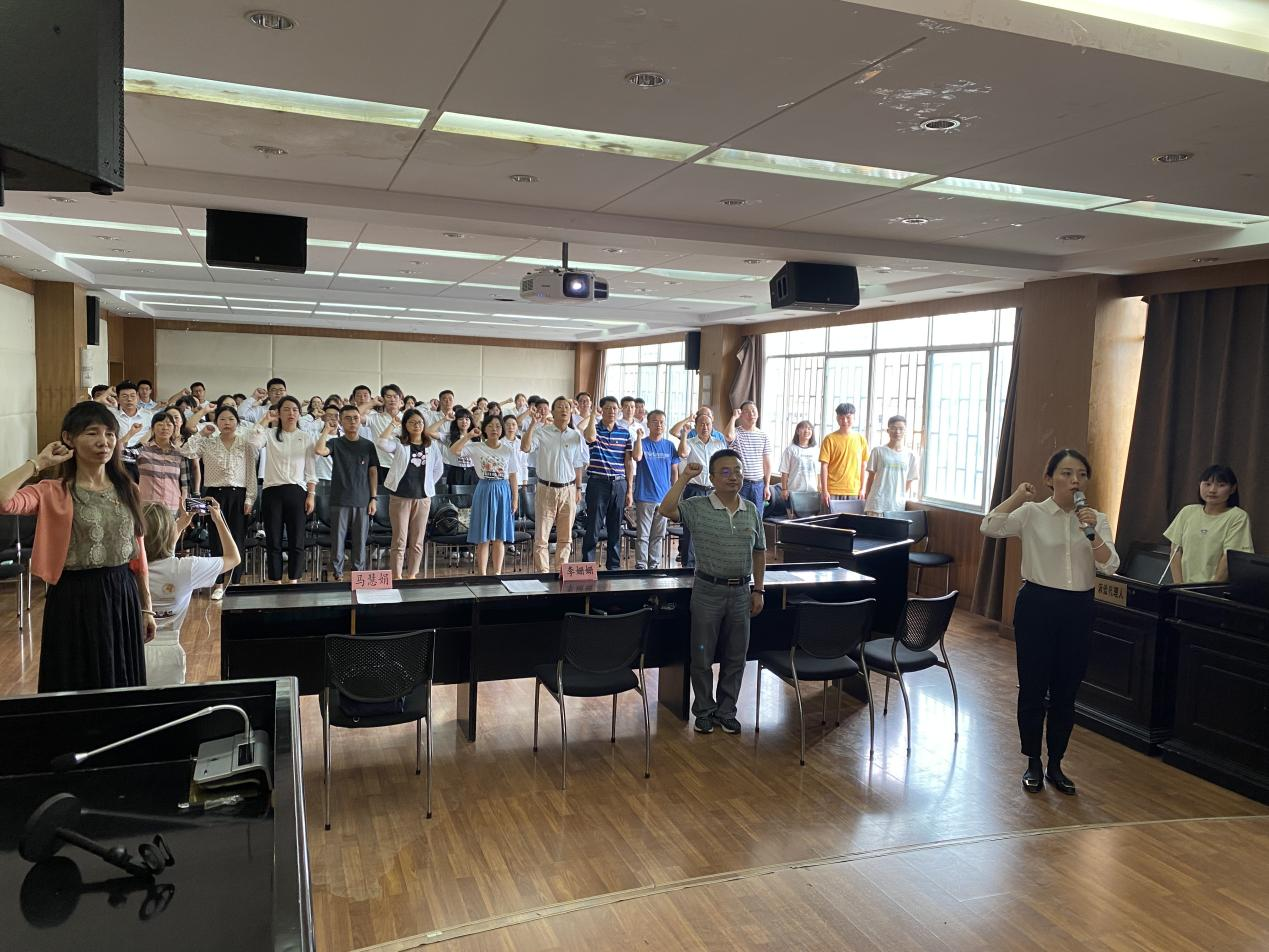 在观看《将入党誓词写成歌》视频后,举行新党员入党宣誓仪式及老党员重温入党誓词,李姗姗领誓,新党员代表张家静发言。她说:“学生党员是学校党组织与青年学生联系最紧密的纽带和桥梁,学生党员应当在思想方面,学习方面和行动方面做好表率,紧密团结在党中央的周围,以青春之名,耀信仰之光”。