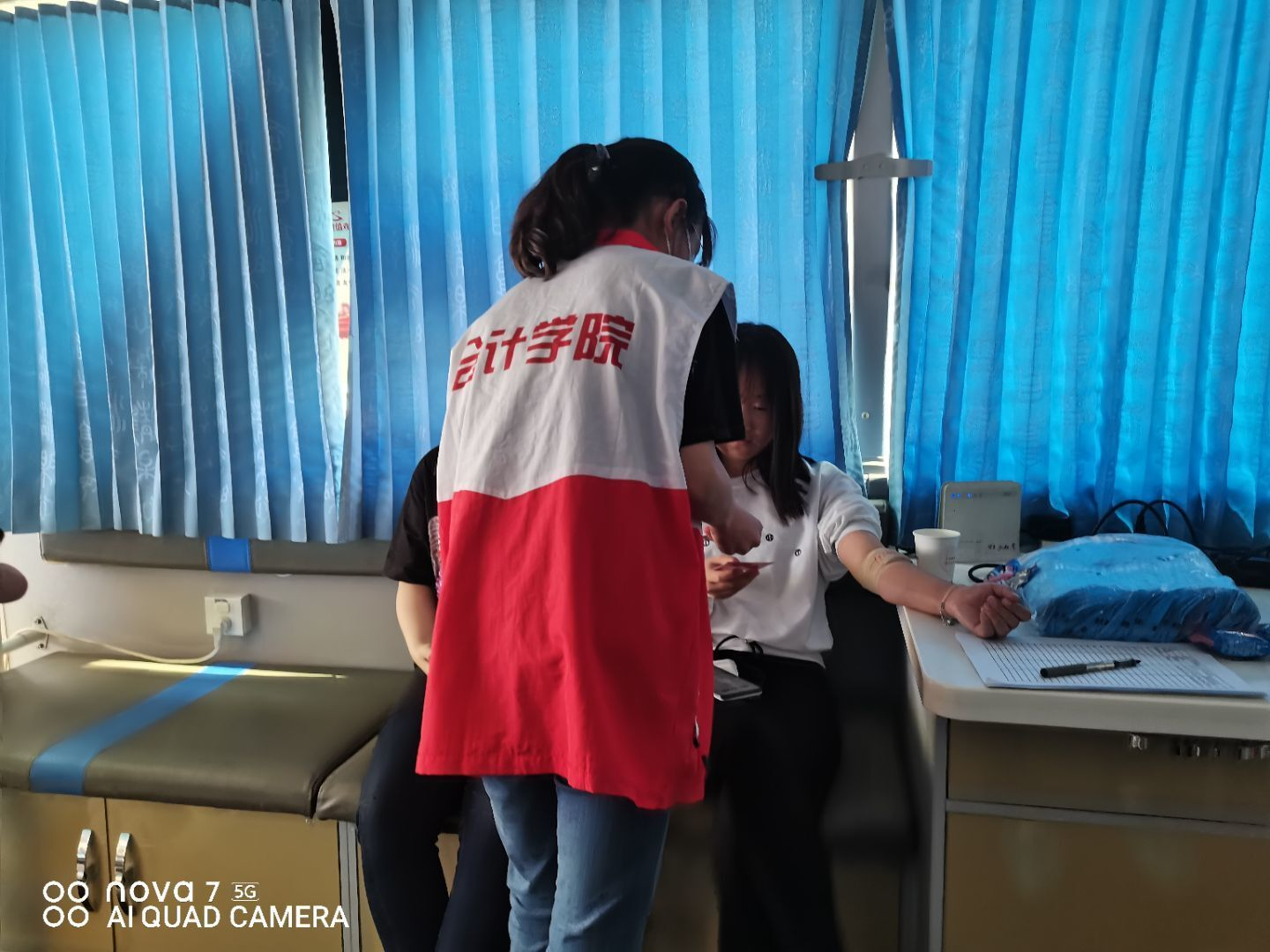 献血车进校园志愿服务活动中,志愿者们分5班,每班5人,以一个半小时为分界进行志愿服务活动,三人负责为志愿者提供帮助,另外两人在献血车内负责打印献血证以及帮助医生。