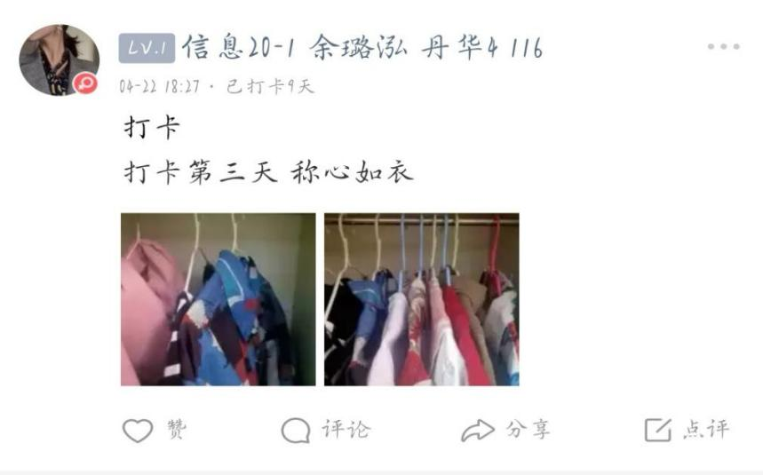 在4月19日—4月22日“一屋不整,何以为家”主题活动中,同学们按照每日清洁主题,打扫宿舍卫生,并利用“小打卡”微信小程序进行活动打卡。